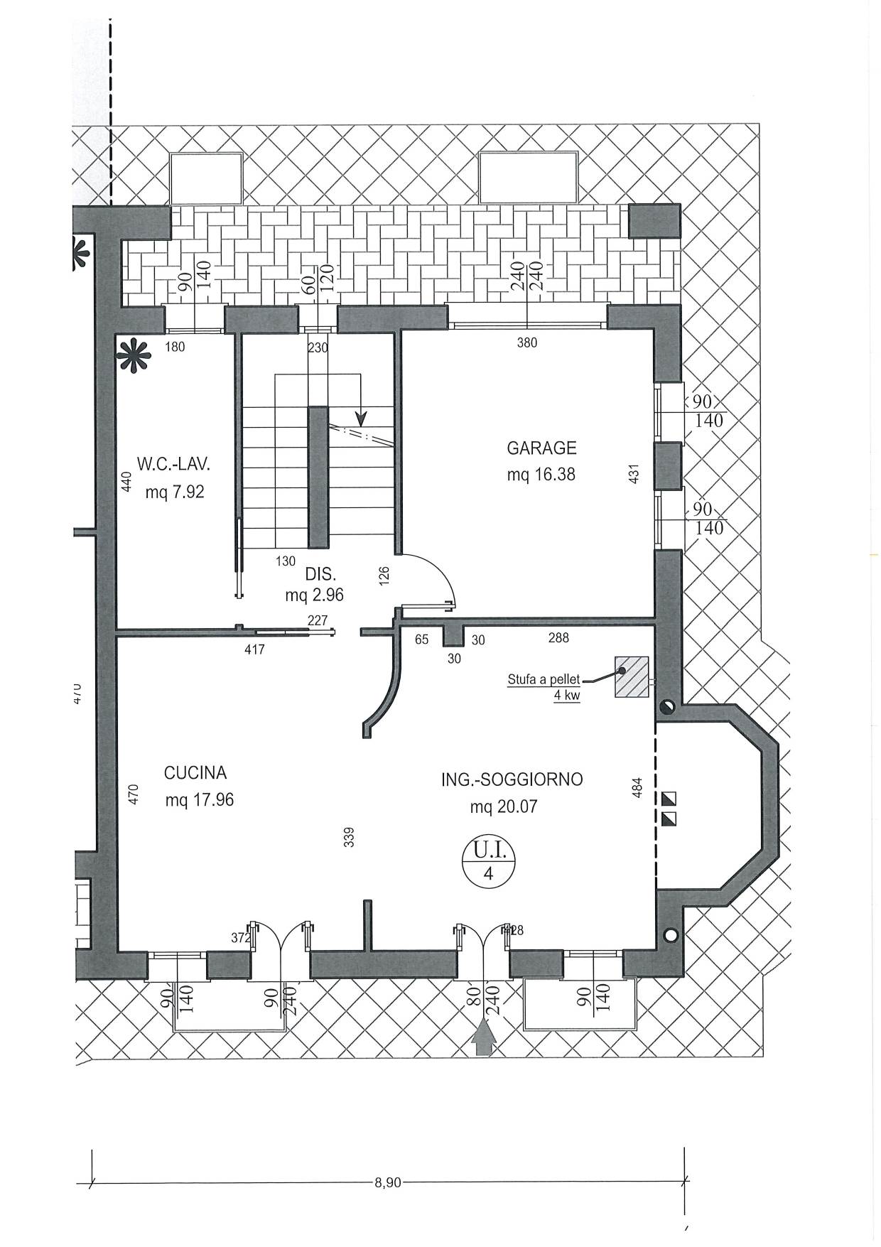 PIANO TERRA: soggiorno cucina di 40mq, disimpegno, bagno lavanderia e garage;