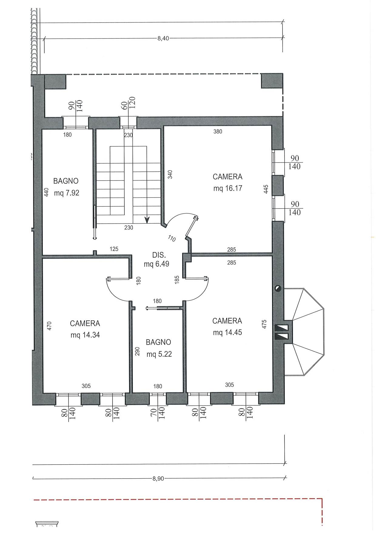 PIANO PRIMO: tre camere matrimoniali, disimpegno e due bagni;