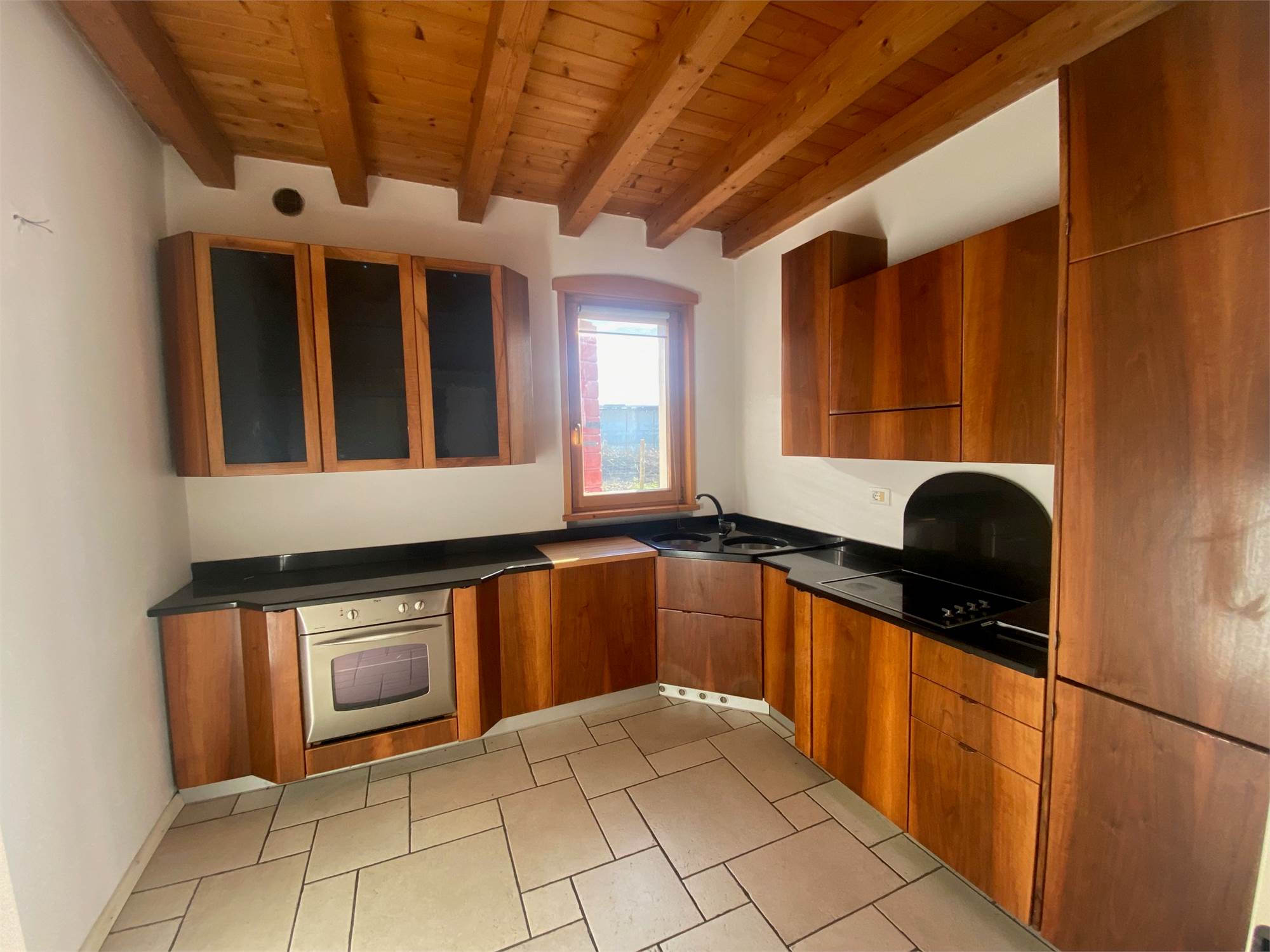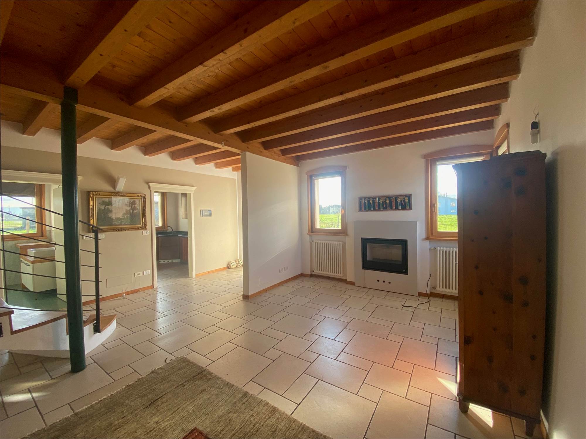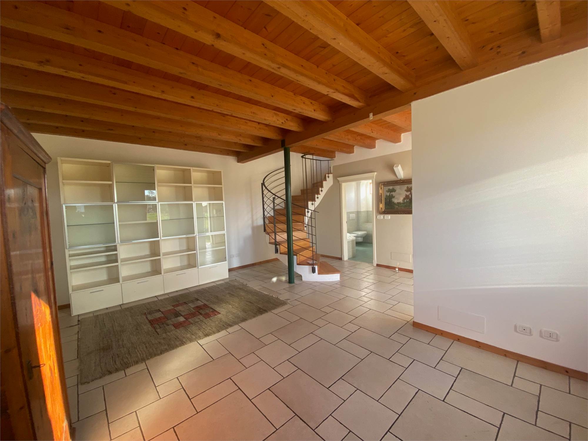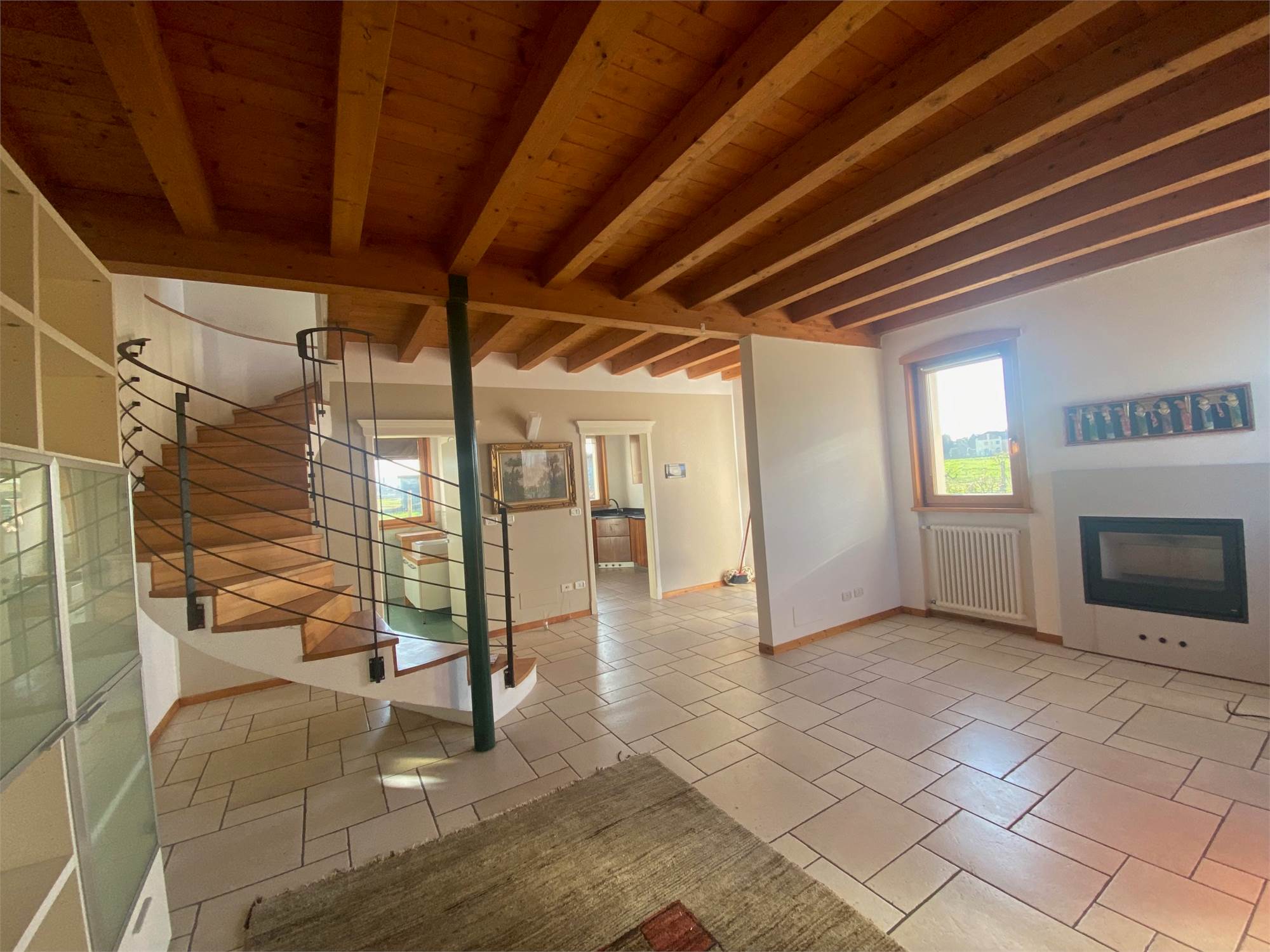 DOSSON, adiacente al centro, zona verde e tranquilla, villetta di testa travata a vista con giardino privato di circa 500 mq, disposta su tre livelli, composta da ingresso, soggiorno con caminetto, cucina separata, bagno e posti auto al piano terra, due ampie camere, disimpegno, e bagno al piano primo, stanza soppalcata al secondo piano. Termogas autonomo, esposta a sud ovest nord, venduta con arredo cucina e arredo bagni. Cl. D ipe 150. Euro 289.000. Rif. 224 - STUDIO IMMOBILMARCA